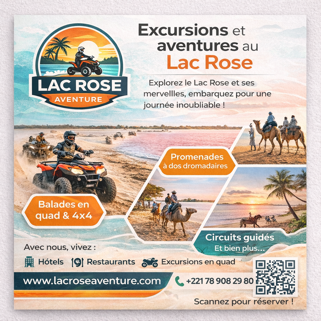 Lac Rose Aventure vous permet de réserver plus facilement des excursions en quad, des chambres, des hébergements, des expériences de restauration et des activités de loisirs au Lac Rose. La plateforme met en avant des offres claires, un contact rapide par WhatsApp, une information structurée et un accès simple aux réservations.